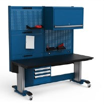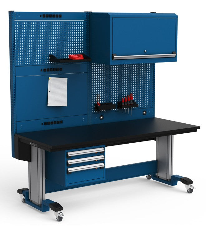 Rousseau Model EK27LH-ED1005 Elevatek 6 foot adjustable height workbench with electric height adjustment, plastic laminate top, power strip, 3 drawer cabinet, overhead cabinet, casters, and pegboard panels (72"L x 30"D)